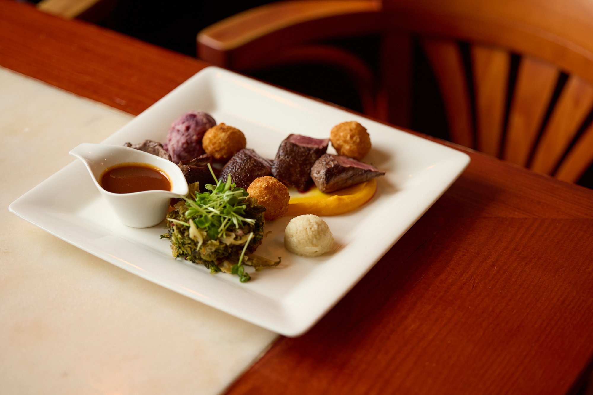 Zalmfilet met prei, witte wijnsaus puree en Mediterraanse crumbel of Fazant fine champagne met witloof en amandelkroketten